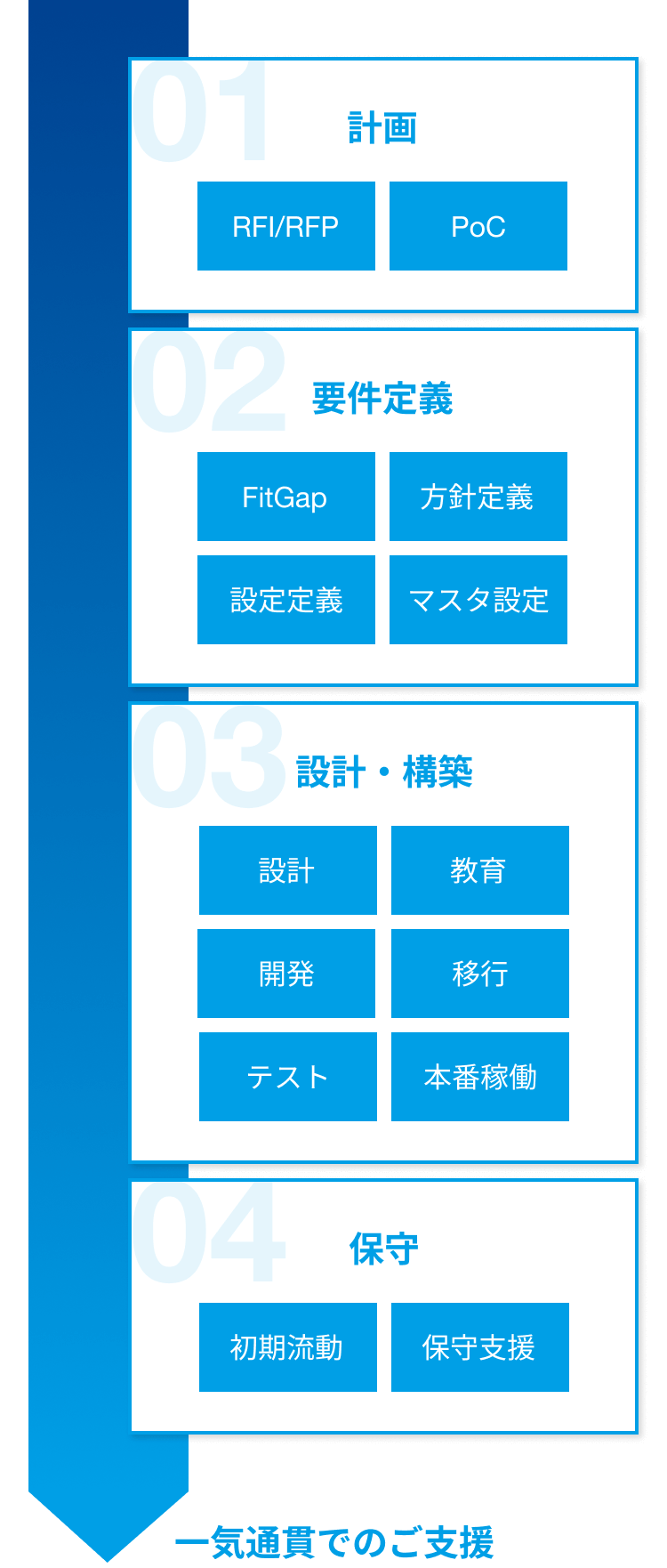 RFIの回答からRFPに対するご提案、現状分析もしくはPoC、要件定義、設計・開発・テスト、本番稼働、保守サービスまで、一気通貫でご支援しております。